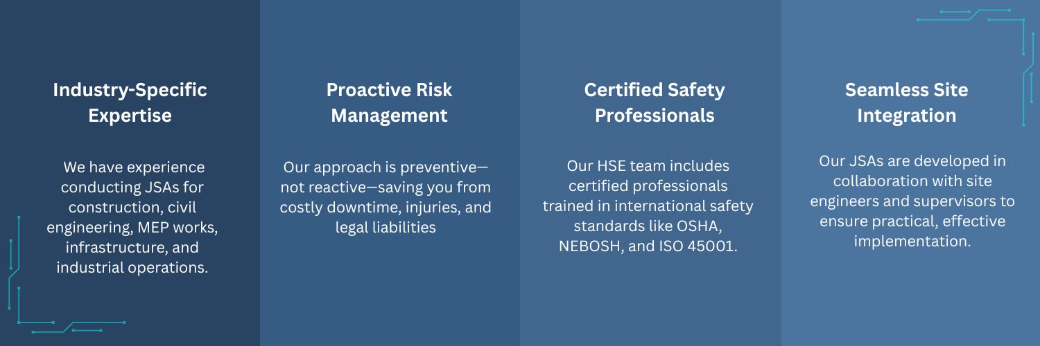 At DNCBOT, we take safety seriously. Our Job Safety Analysis (JSA) Services are designed to identify, evaluate, and eliminate workplace hazards before work begins. By analyzing each task step-by-step, we help ensure safer job sites, reduced incidents, and a strong safety culture across all phases of your project.