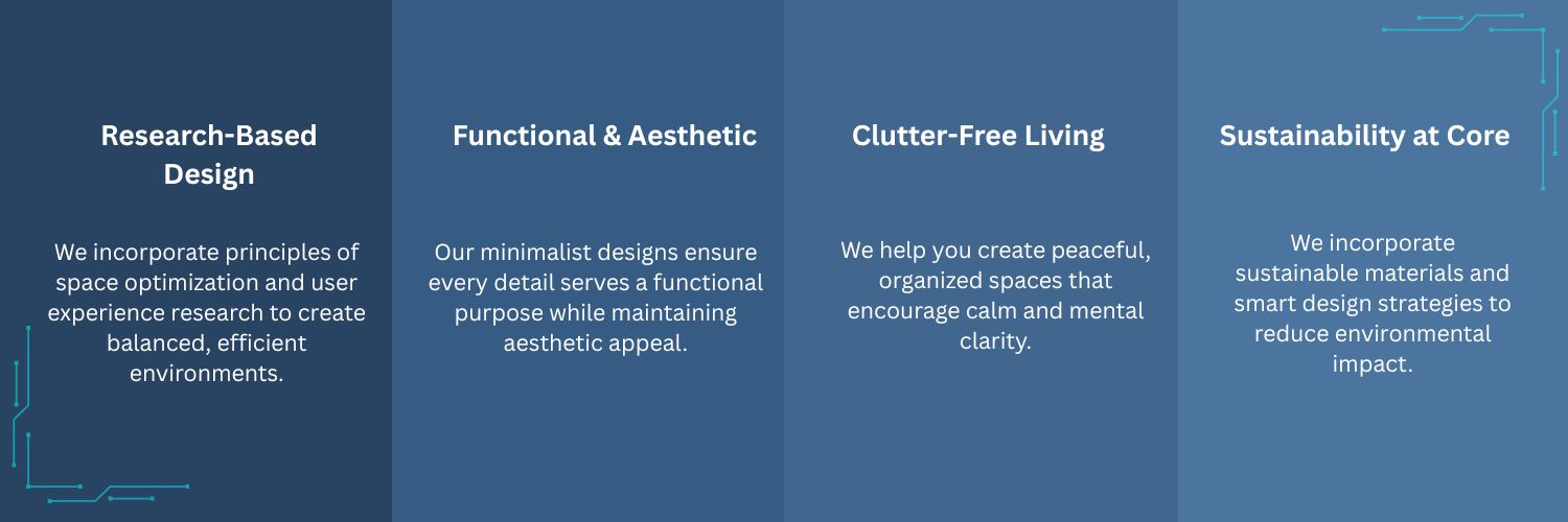 • We focus on essential items, removing excess to create visually and mentally decluttered spaces. Our minimalist designs are rooted in function, promoting balance without compromising style