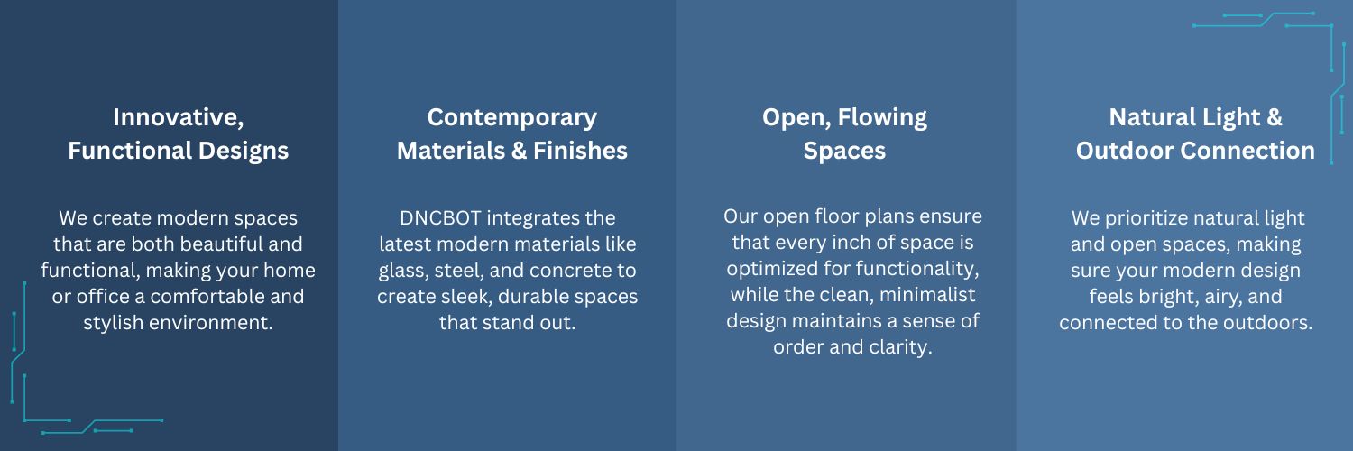 Ready to bring modern design into your home or project? Let DNCBOT help you create a sleek, functional space that combines simplicity with cutting-edge materials and design.