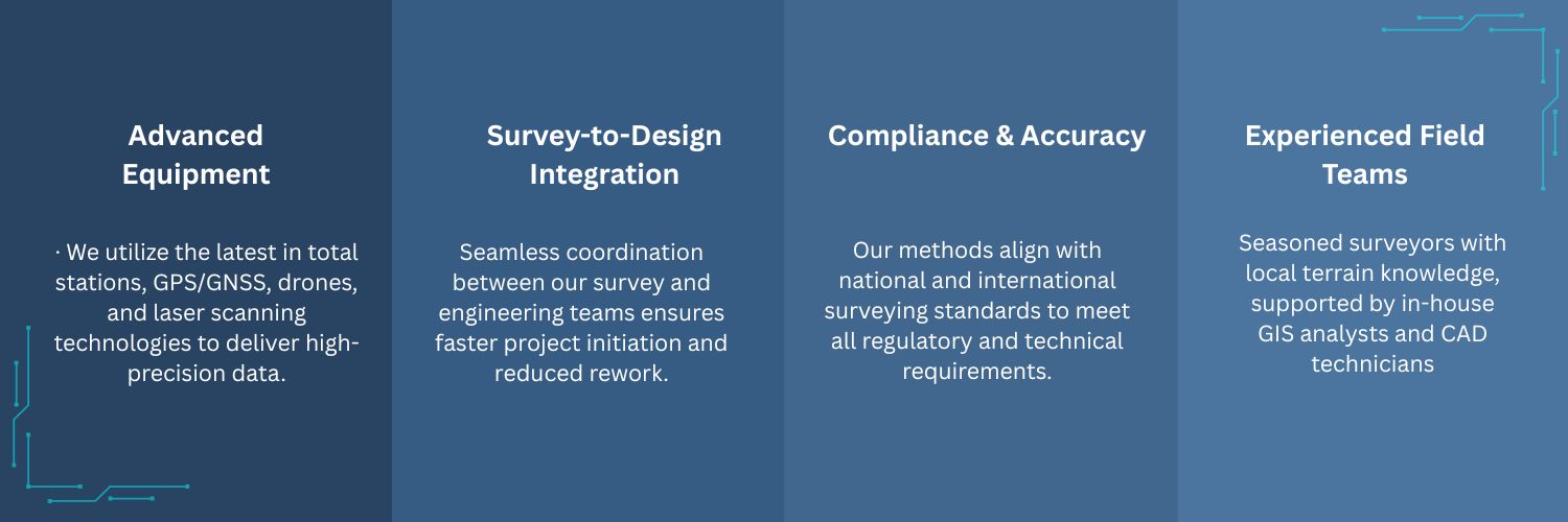 • On-site layout and alignment for buildings, roads, and utilities to ensure exact positioning during execution.