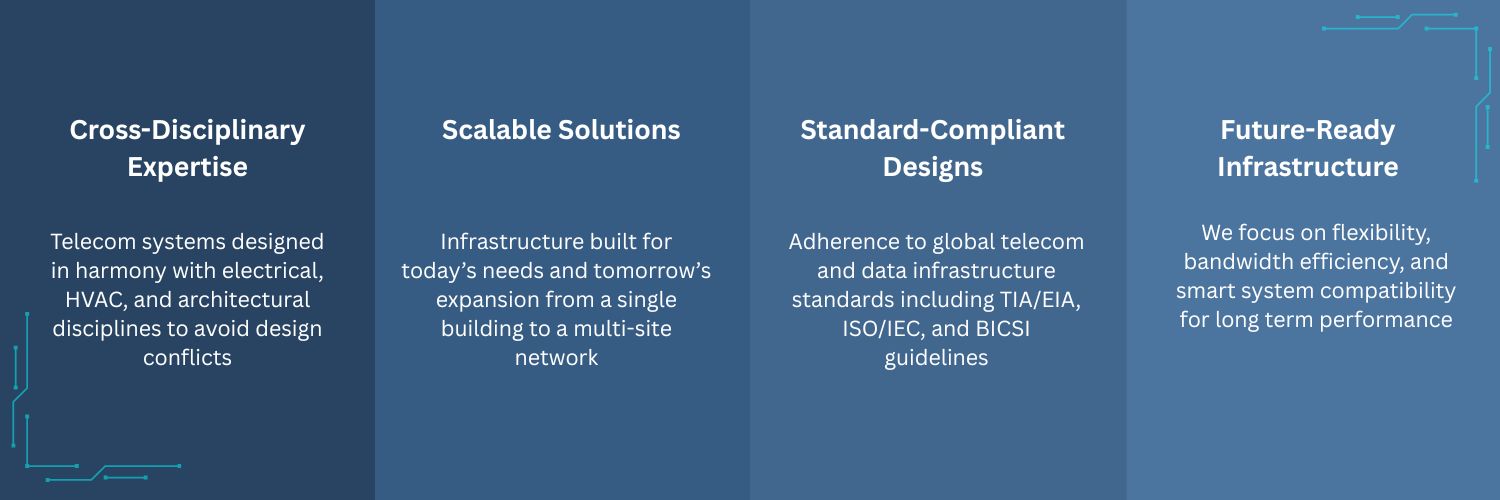 Space planning and design of server rooms, IDF/MDF rooms, and telecom closets with cooling, power, and access control